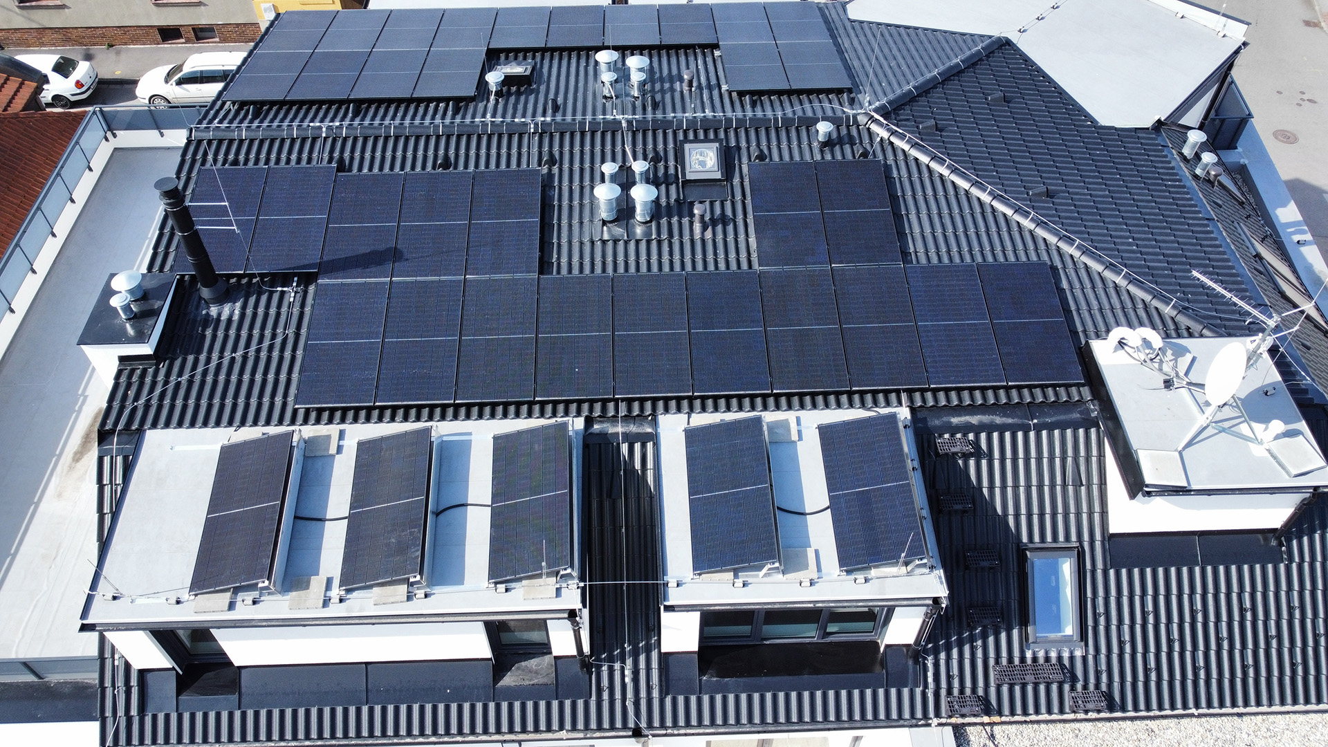 Realizace fotovoltaické elektrárny na bytovém domě v jihočeské metropoli. Fotovoltaická elektrárna s bateriovým úložištěm o výkonu 22,8 kWp a akumulací elektřiny 12 kWh.